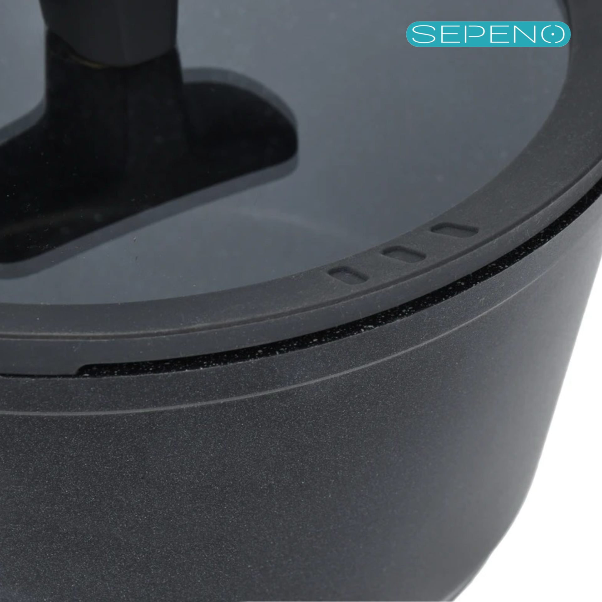 1. درب سیلیکونی با شیشه تمپرد نشکن که حفره تخلیه بخار نیز از این درب حذف شده و در قسمت حاشیه سیلیکونی درب برای تخلیه بخار به میزان کنترل شده و همچنین قابلیت آبکش کردن به وسیله درب در آن قرار گرفته است.